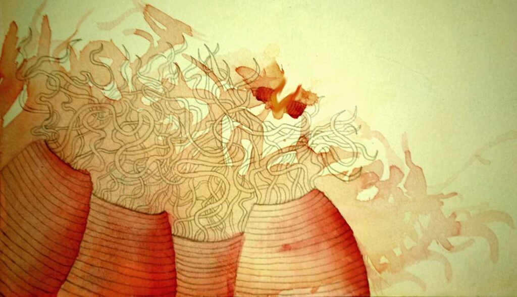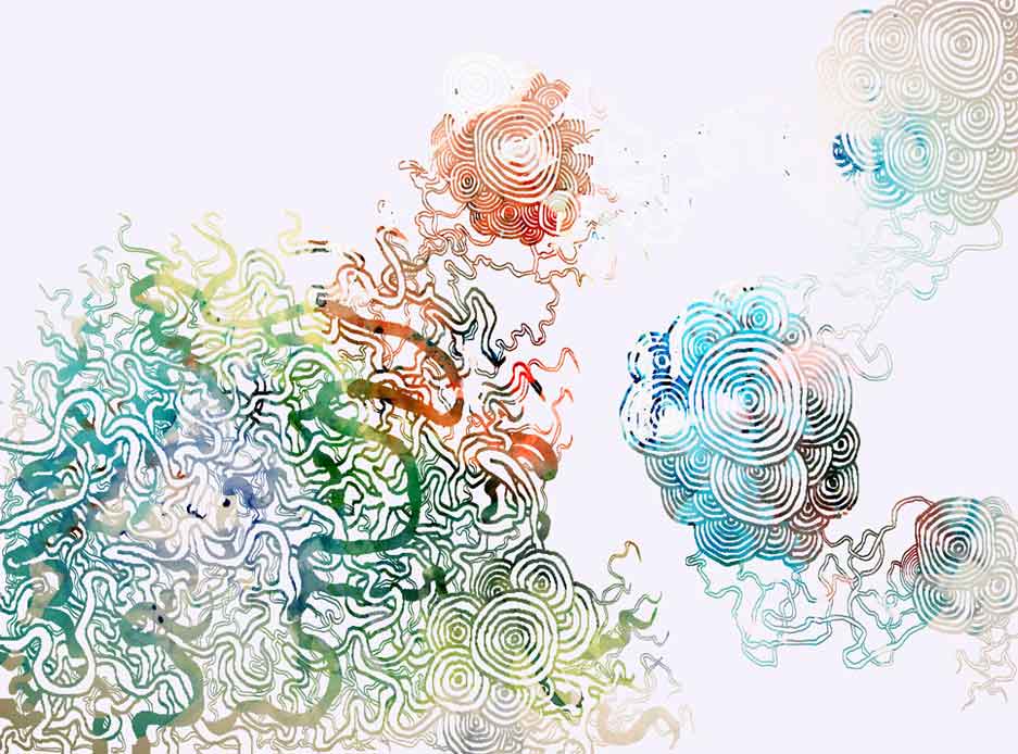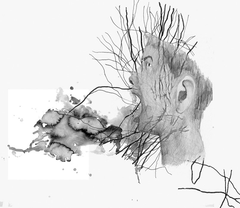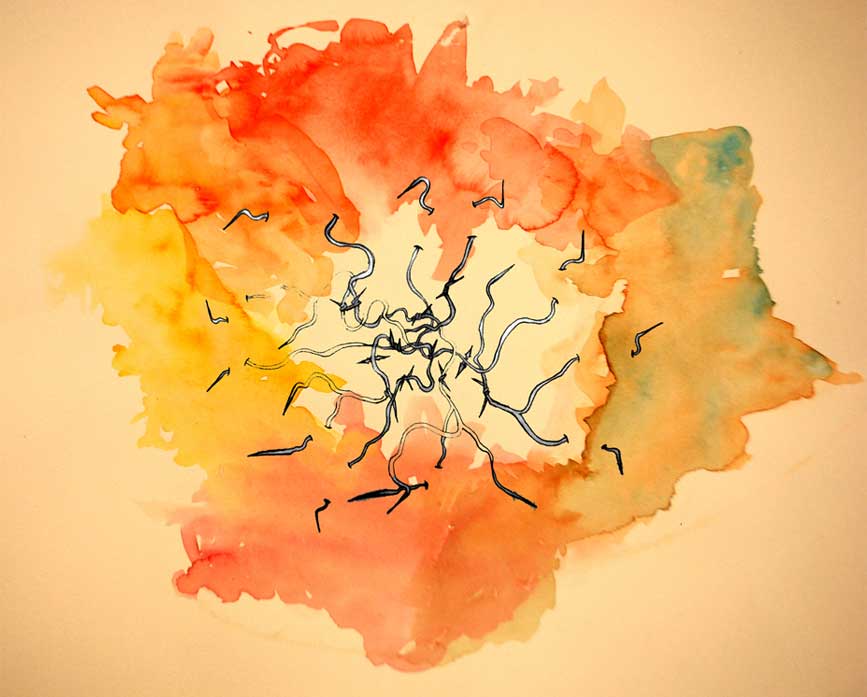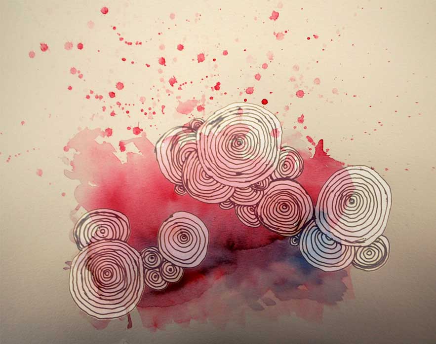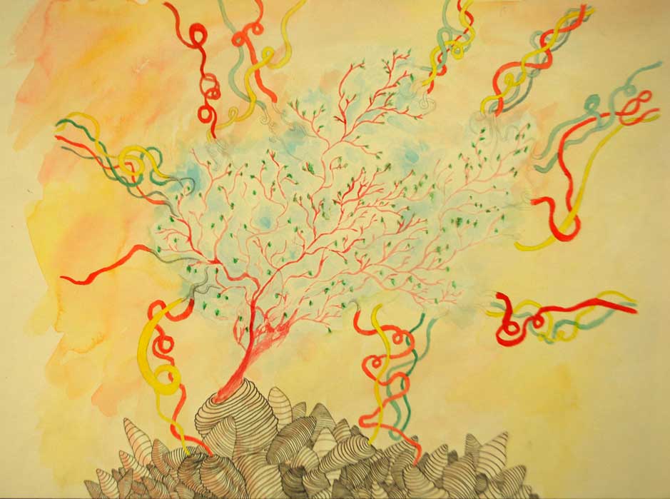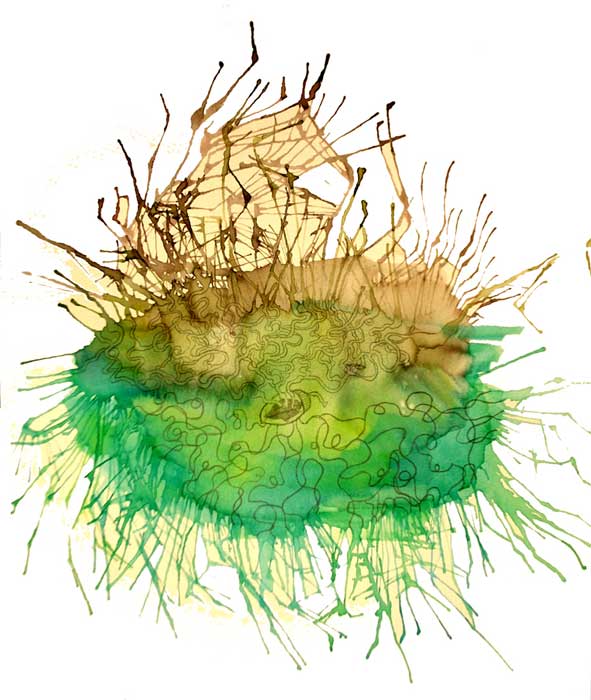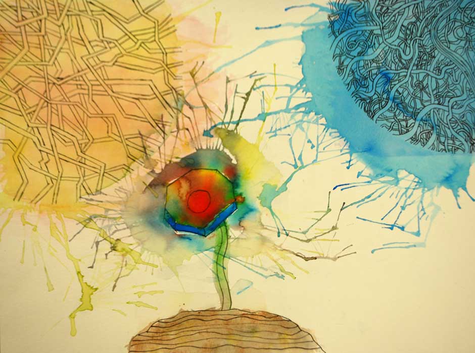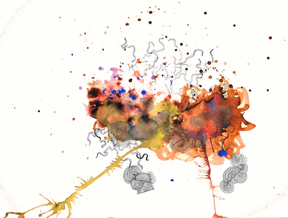 In images 1, 2, and 3, I started my concentration out with pure washes of watercolor. I used a straw to blow the area, creating exciting shapes for me. I then began to use pen, colored pencil and other dry media to expand my concentration. I repeated certain shapes and designs throughout and pushed each piece until satisfied. I eventually began to incorporate Photoshop into my work as a tool to explore my concentration. In pieces 5, 8, 9, and 11 I played with opacities and erasure digitally until I found the right balance of layering and transparency of the work.
